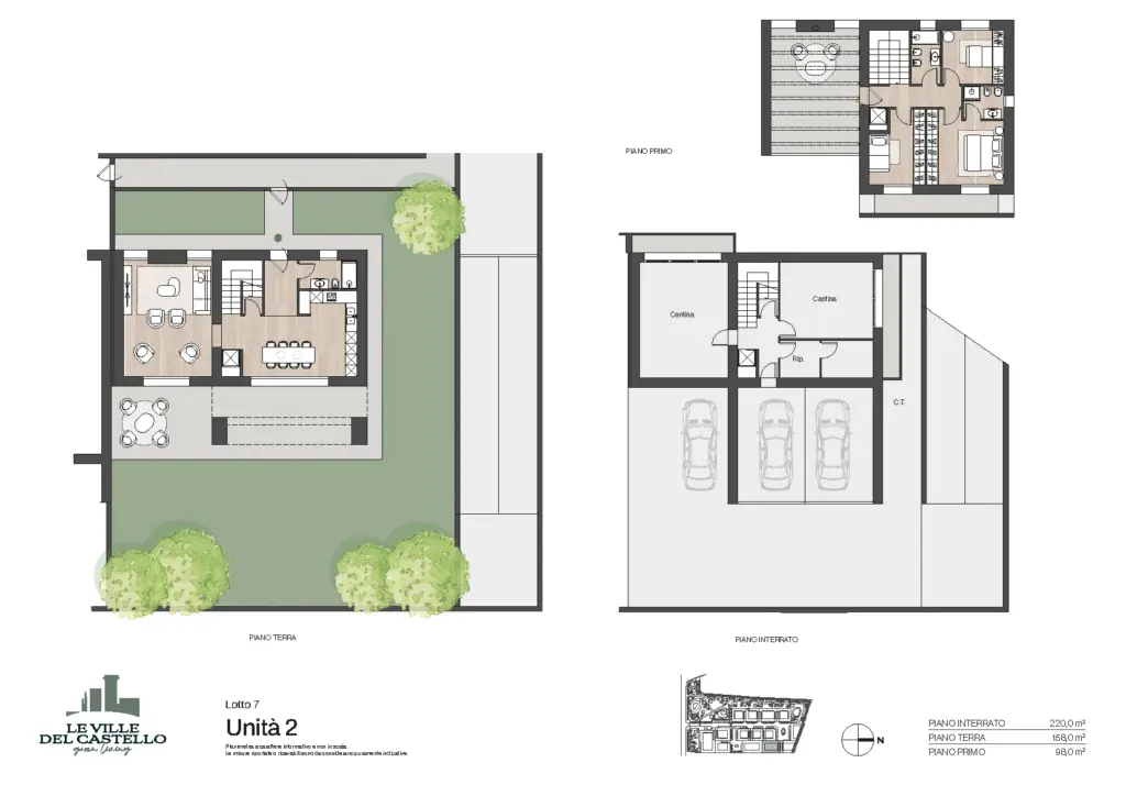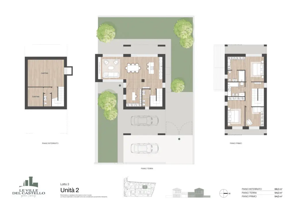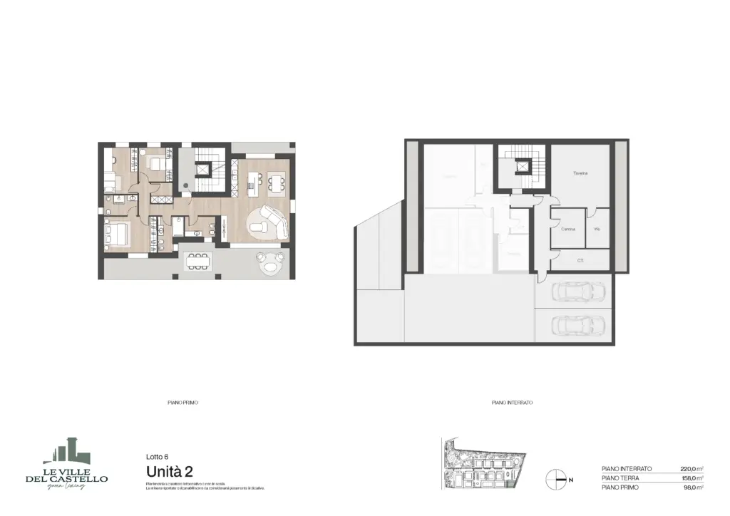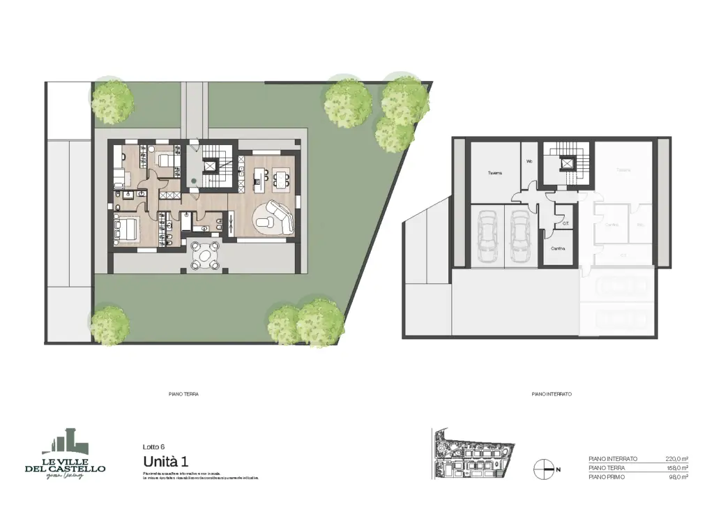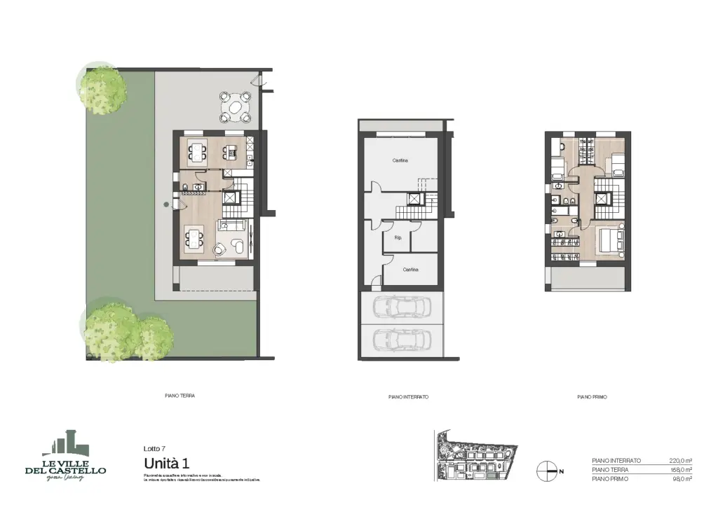Il progetto realizzato per la soluzione bifamilare si compone di due villette (Unità 1 e Unità 2) con giardino privato al piano terra o terrazzo al piano primo.