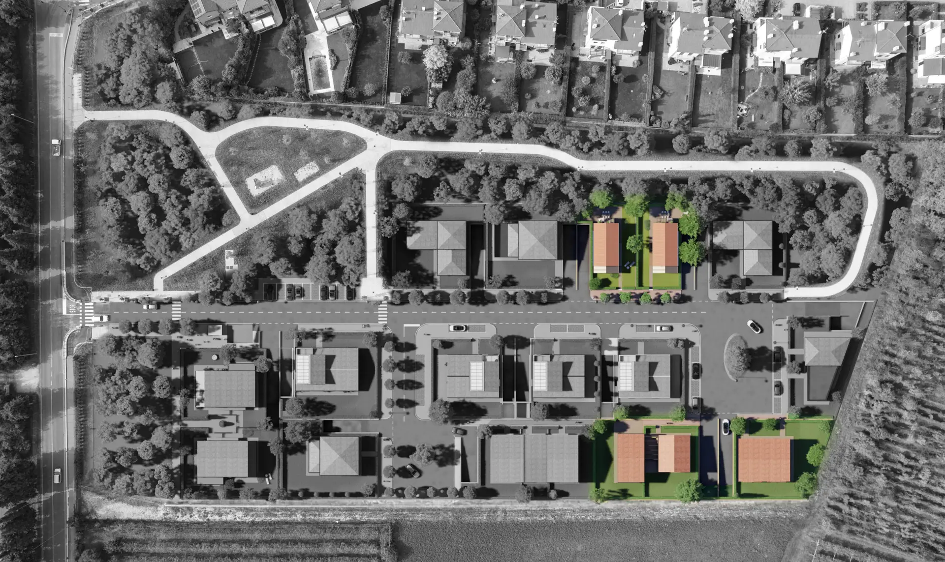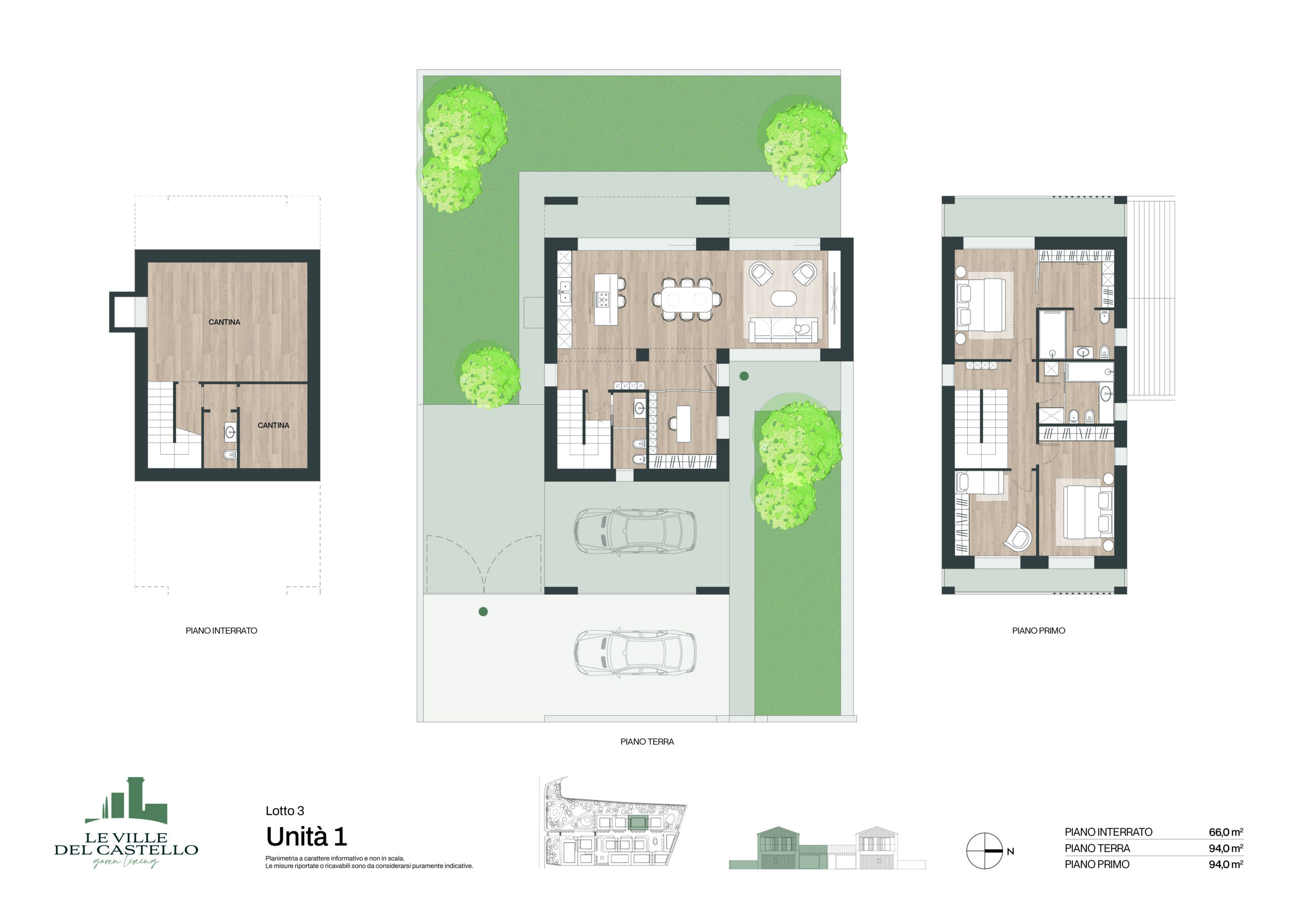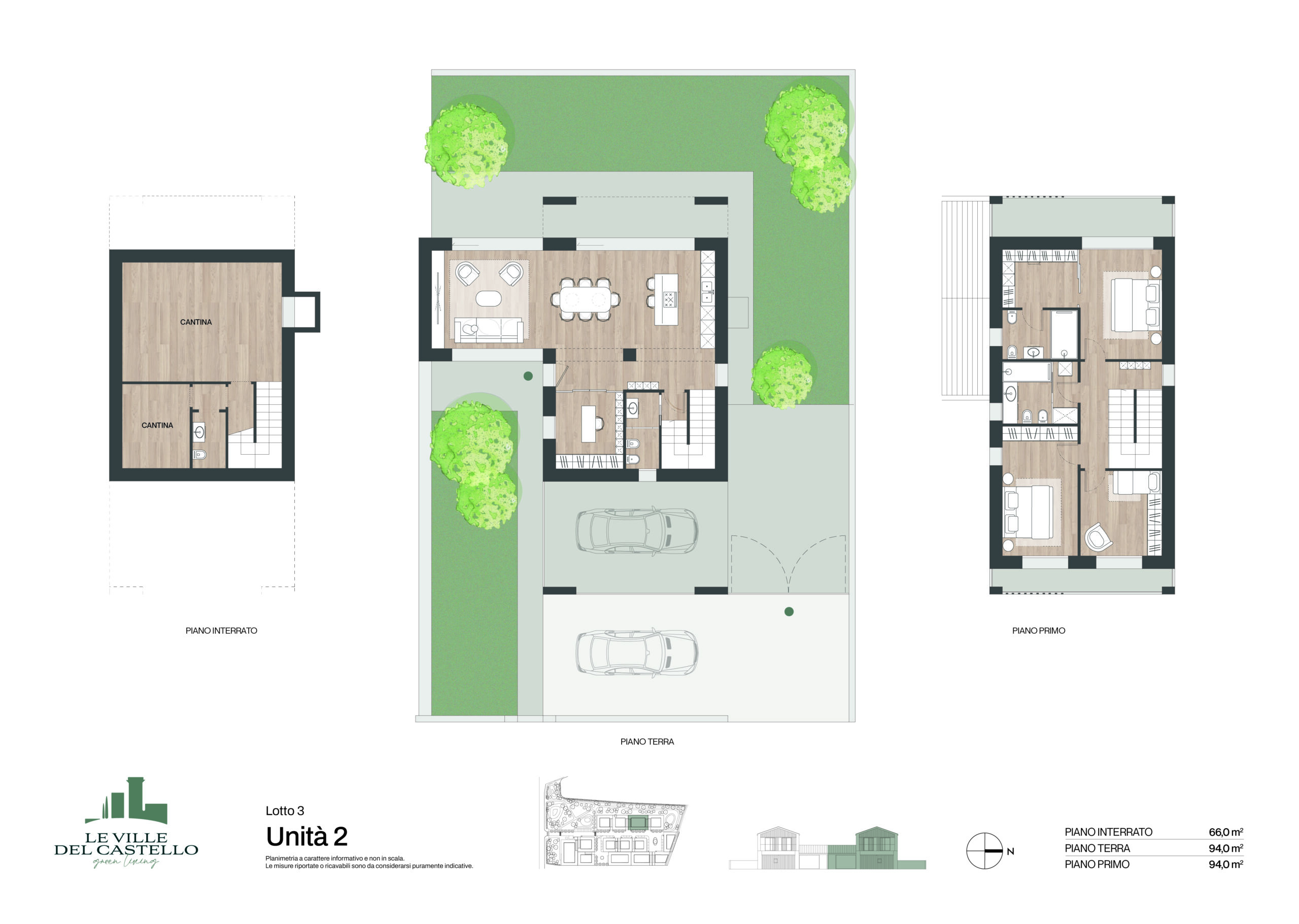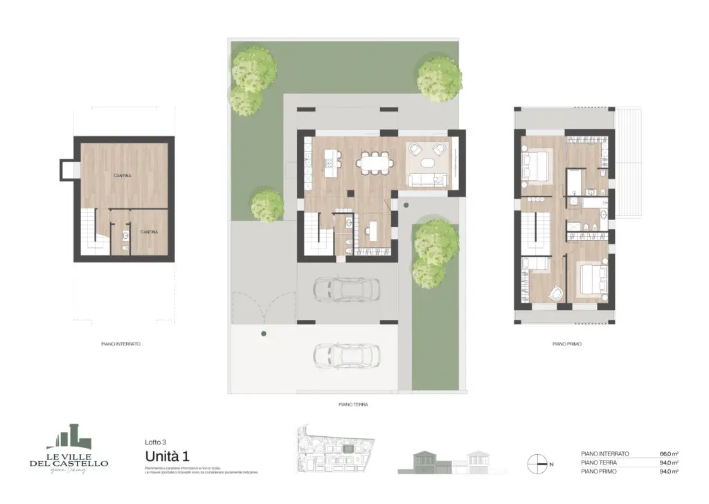 Il progetto realizzato per la soluzione bifamilare si compone di due villette (Unità 1 e Unità 2) con giardino privato al piano terra o terrazzo al piano primo.